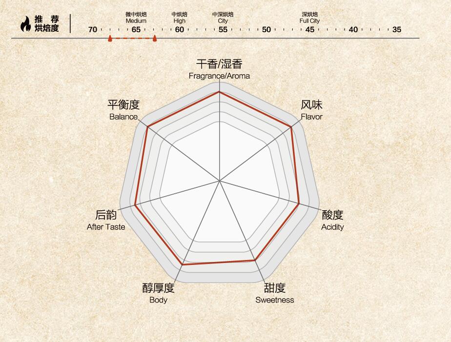 玫瑰(Rose) 尤加利香(Eucalyptus) 蘋果(Apple) 菠蘿蜜(Jack Fruit) 肉桂(Cinnamon) 糖漿(Syrup) 烘焙度:Medium (68~63) |