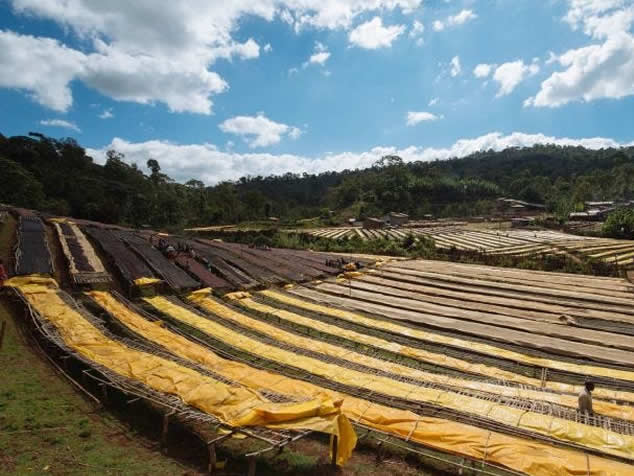 2. 篩選咖啡果實,整顆連肉帶皮的果實平鋪在干曬床上進行晾曬2~4周,自然干燥到含水量約12%。