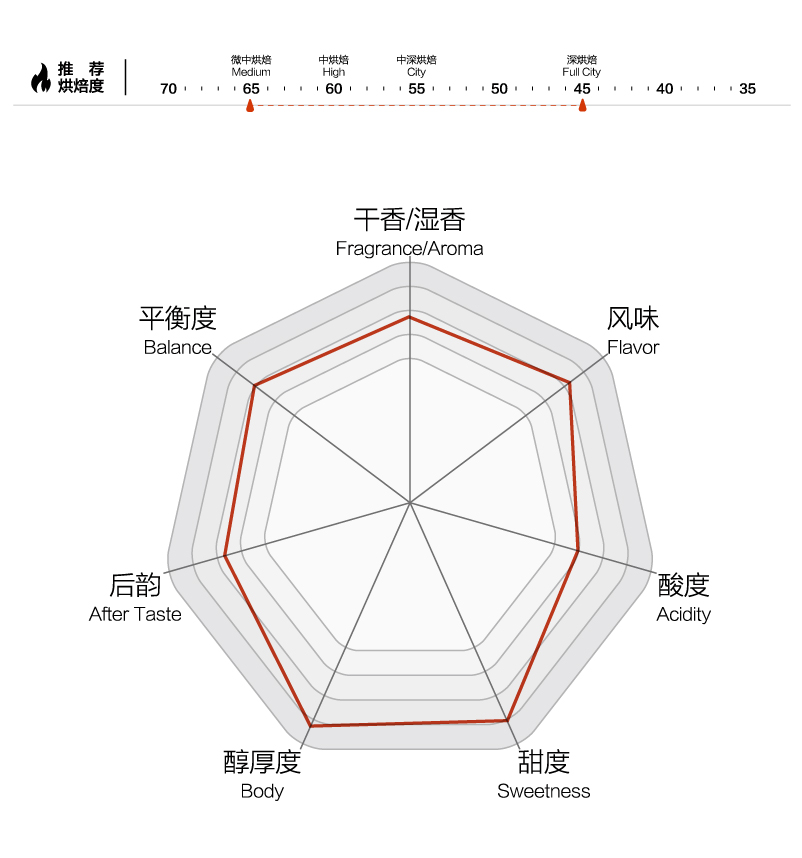 果酸柔和(Soft Acidity) 堅果(Nuts) 可可(Cocoa) 醇厚度高(Well Body) |