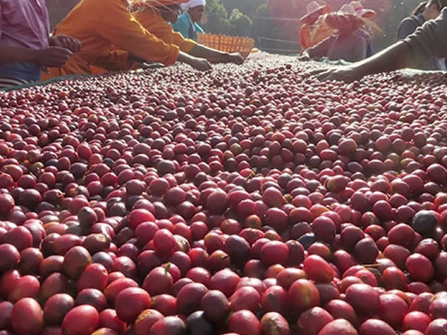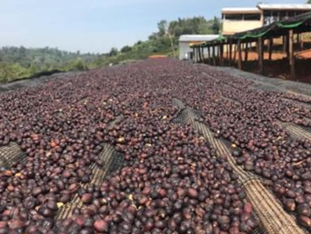 2. 整顆連肉帶皮的咖啡果實,放到干燥床上去日曬,自然干燥14~25天到含水率11%左右